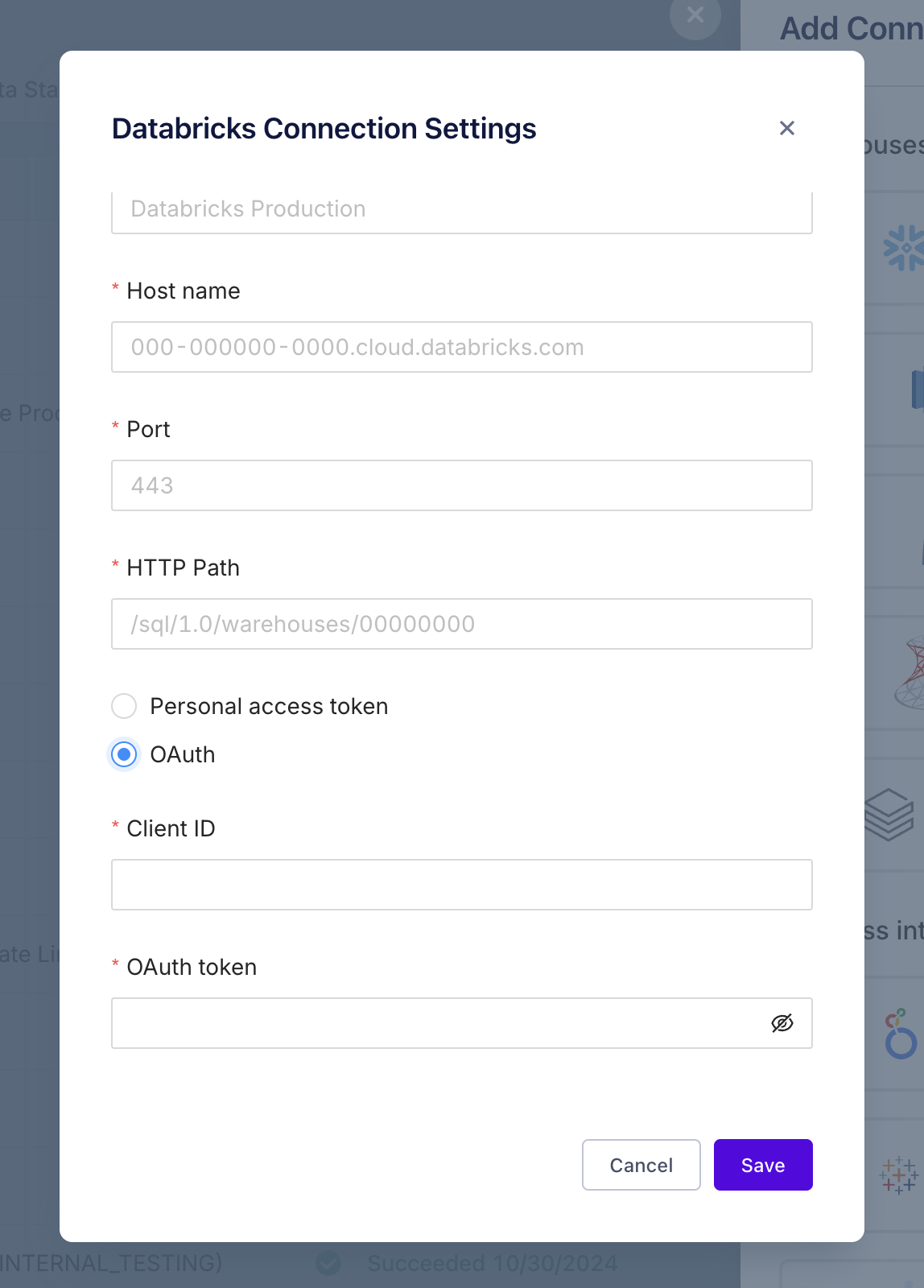 On the connections page, click the 'Add connection' button in the upper right corner and find the Databricks Unity Catalog or Databricks Hive Metastore icon under Warehouses. The Host, Port and HTTP Path fields come from the SQL Warehouse created in Step 3. The OAuth token and client ID come from Step 1.