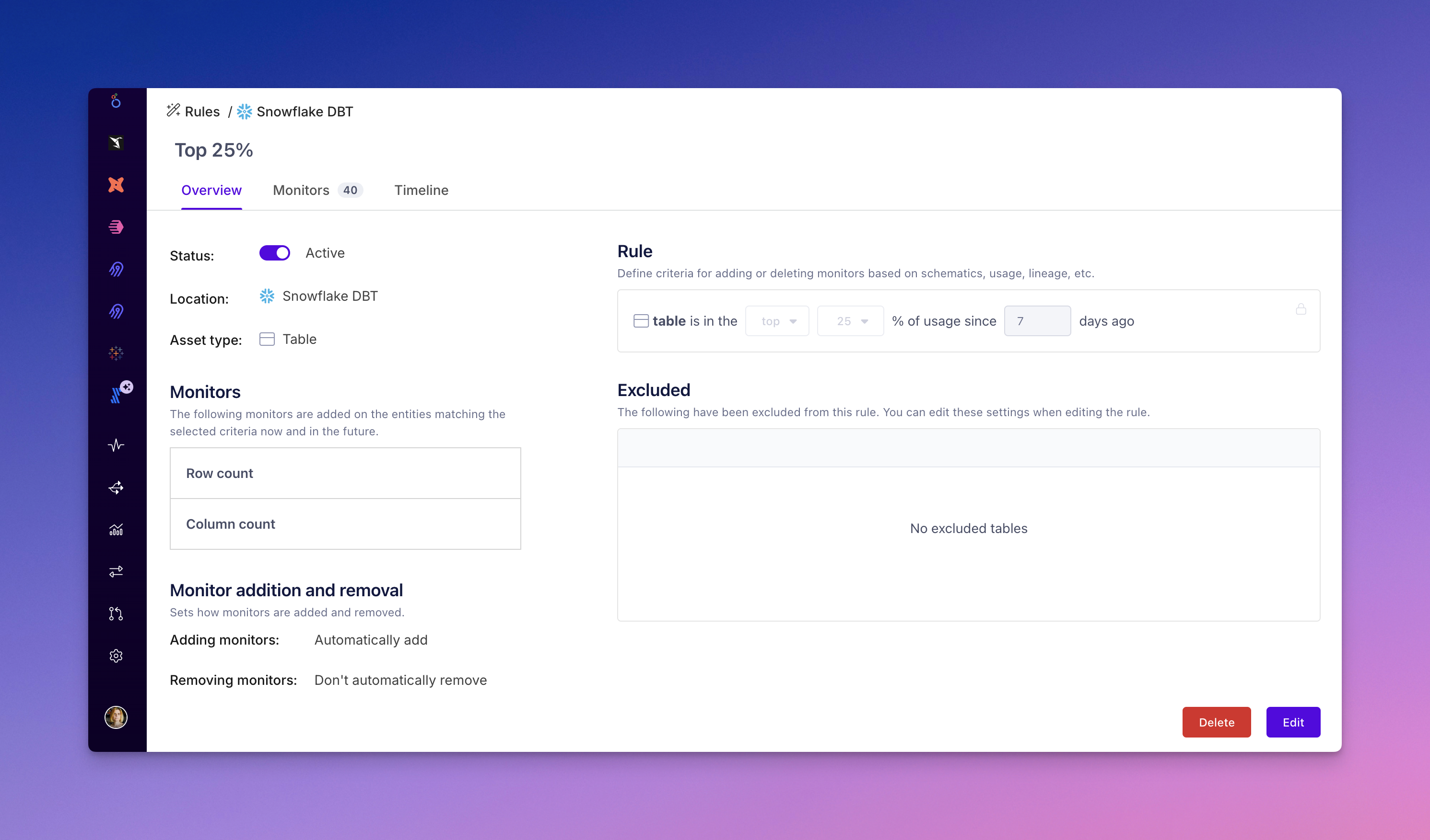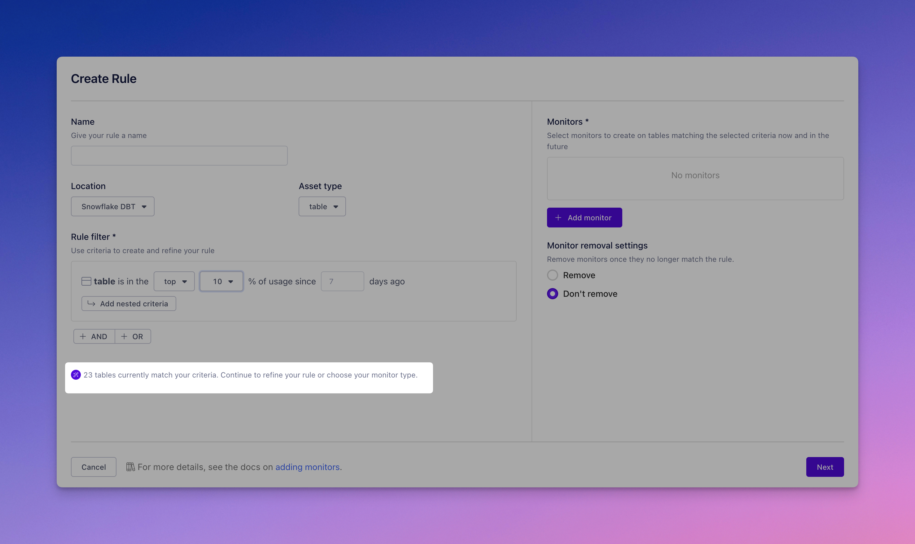 For example, if you have a rule that applies a row count monitor to tables in the top 50% of usage and you update the criteria to tables in the top 25%, some tables that previously matched may no longer meet the new criteria. If you've enabled monitor removal for unmatched assets, these monitors will be removed when you save the changes.