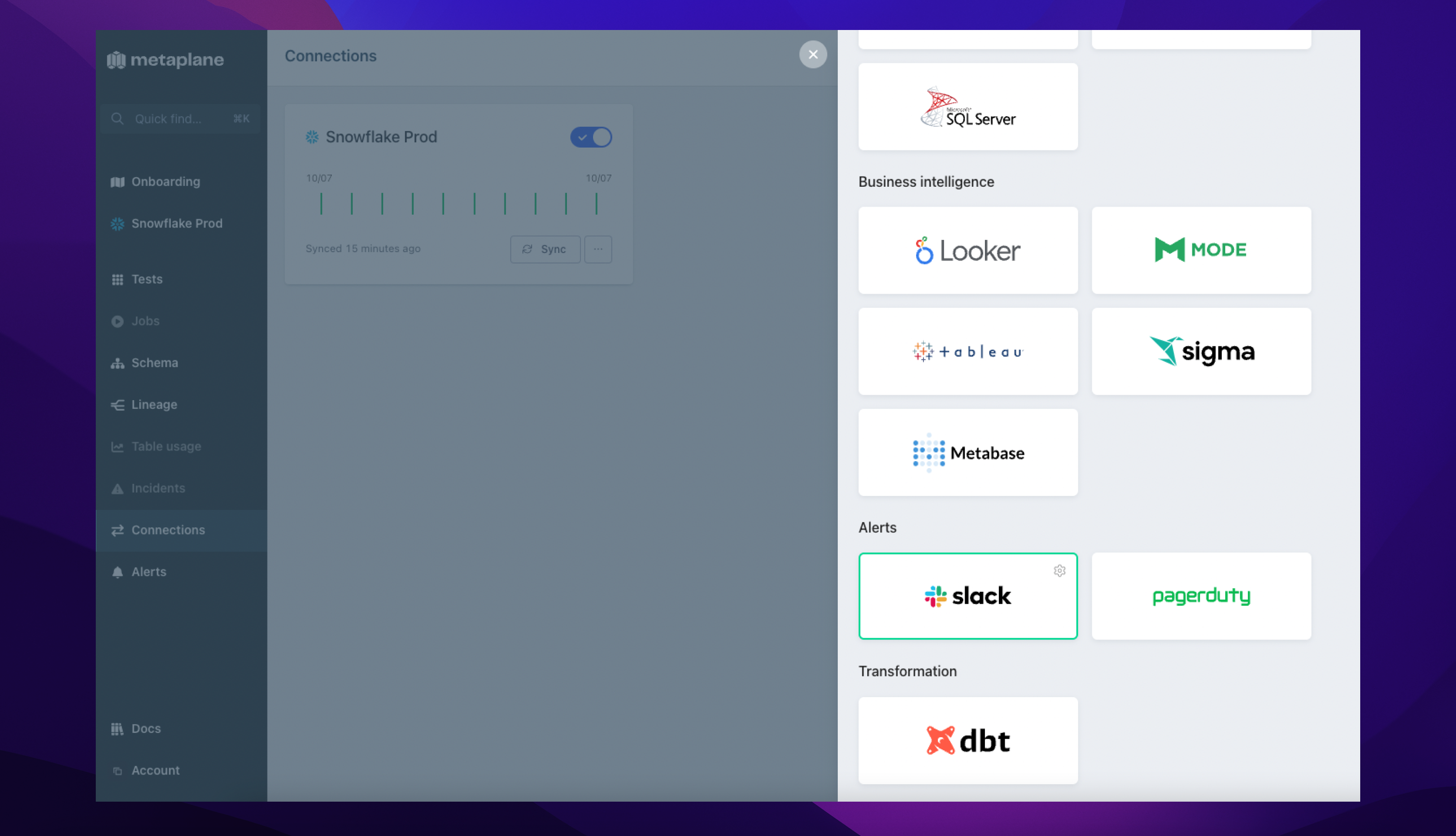 To connect Metaplane's app for Slack, visit the connections page , and scroll down to find "Slack" under Alerts.